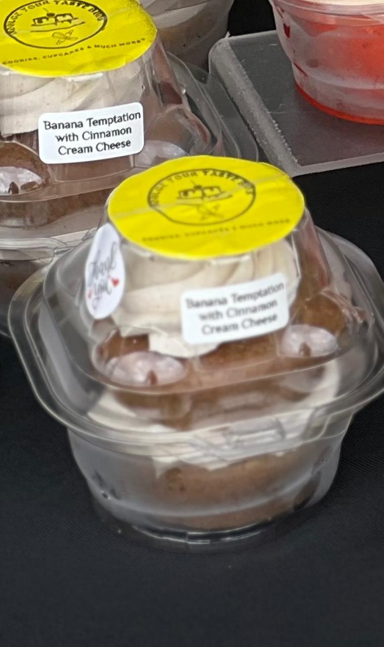 Banana-flavored cupcakes topped with cinnamon buttercream frosting. Sold by the dozen.
